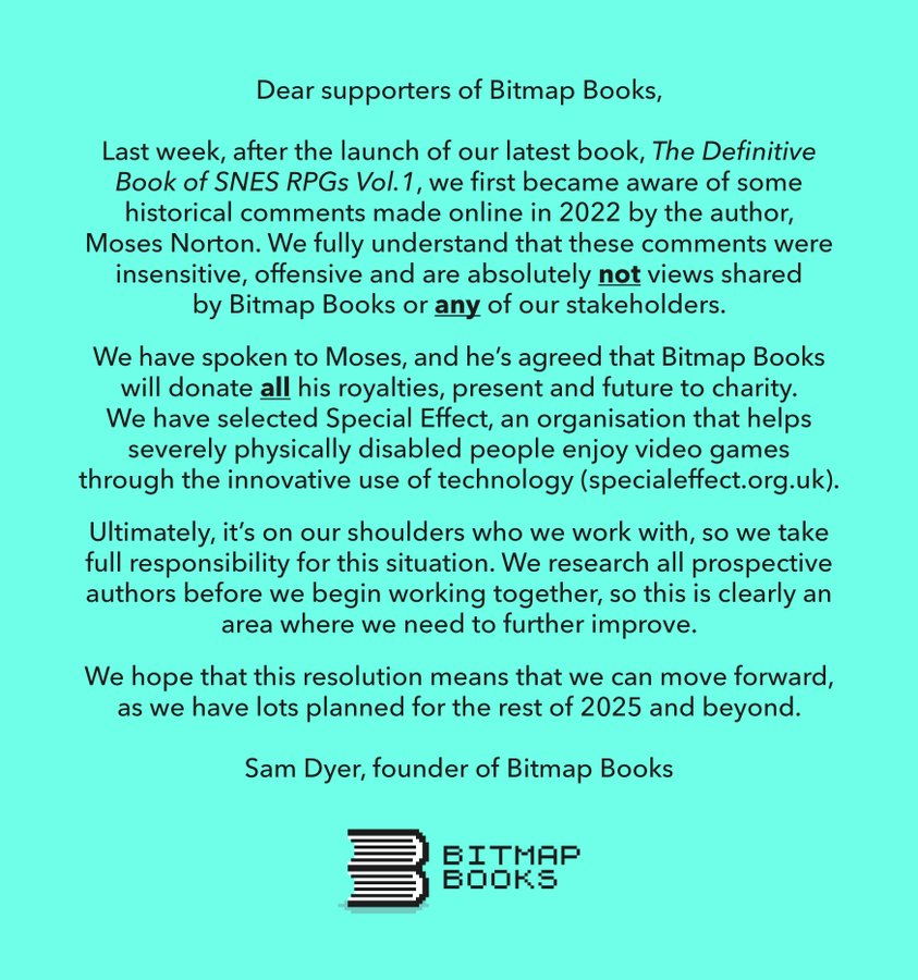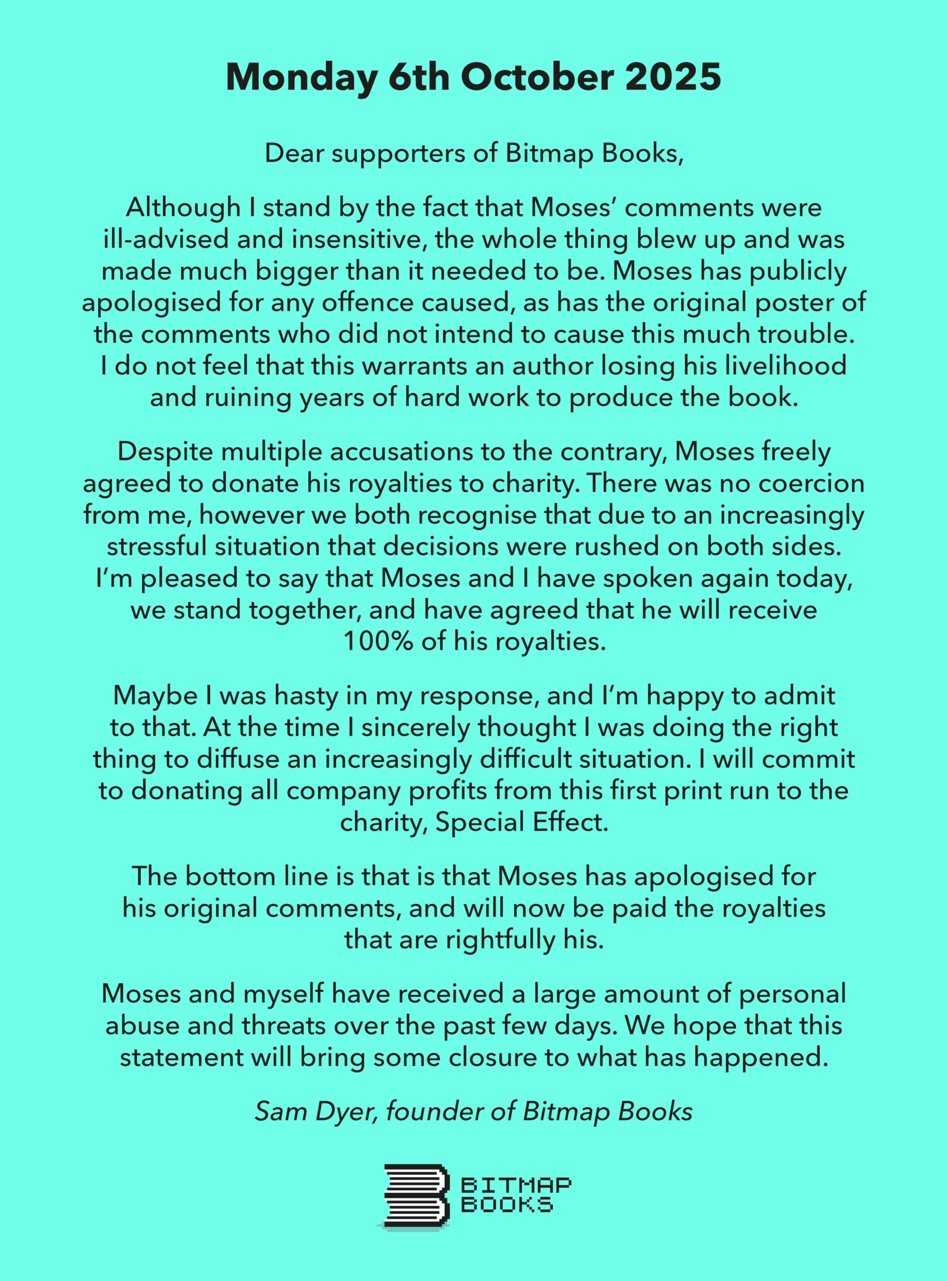 “I would encourage any readers of mine never to buy anything from Bitmap Books, and to let others know about this. Publicity is the only cure for this kind of vileness.”